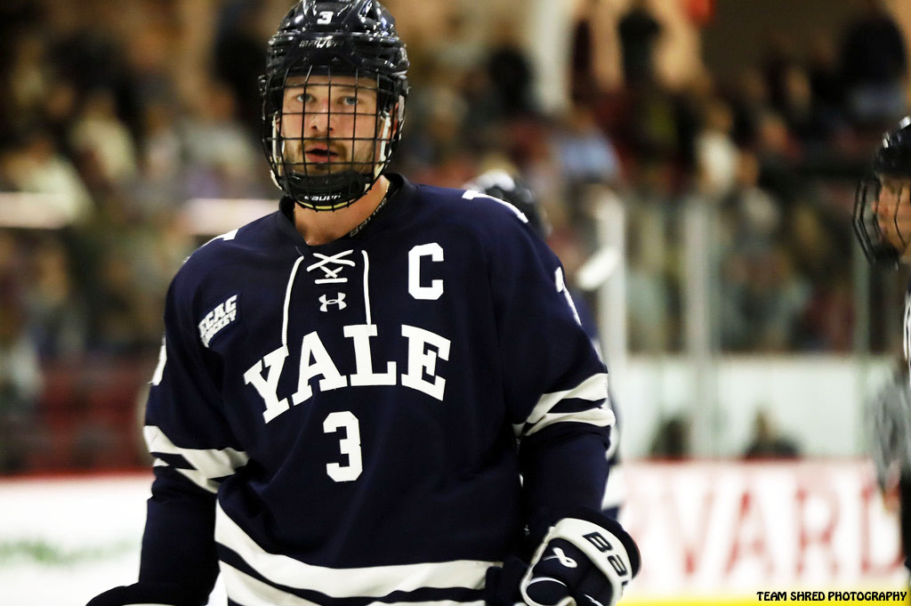 Yale University Bulldogs‘ senior captain defenseman Michael Young(3) is going pro and signs with Anglet Hormadi of Ligue Magnus for 2023/2024 after scoring a college best 5 assists last season for a mostly stay-at-home d-man.