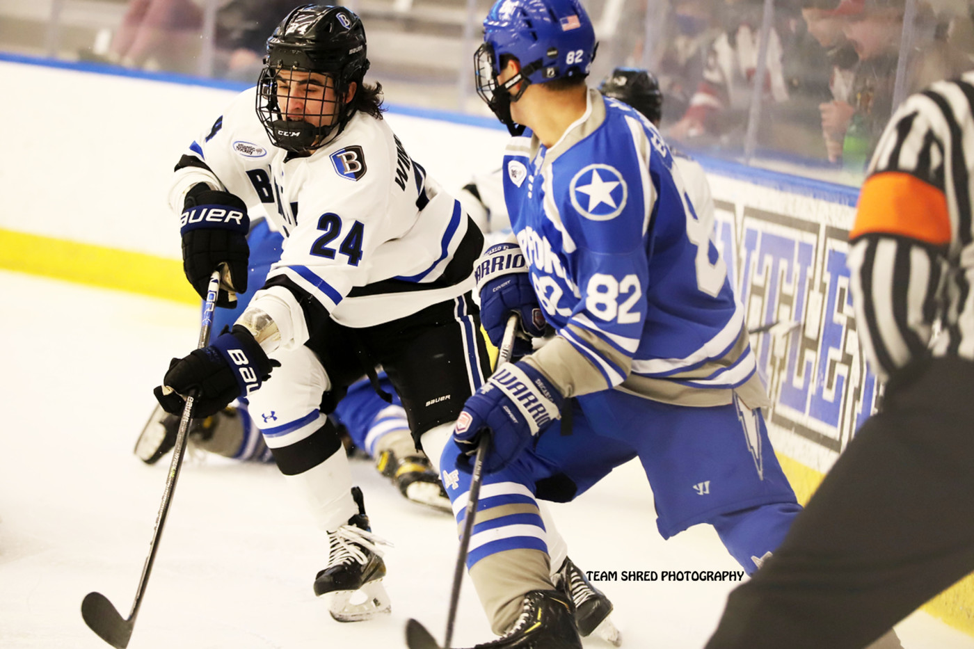 Bentley University Falcons‘ senior center Joe Winkelman(24) signs a 1st from deal with Corsaires de Dunkerque of France2 for 2023/2024 after coming off a modest college best 2 goals and 5 assists in 30 games last season.