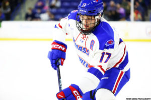 UMass-Lowell Riverhawks‘ senior assistant captain, Slovakian-born defenseman Marek Korencik(17) signs a 1st pro contract with 1st year team, Iowa Heartlanders upon finishing up his studies.