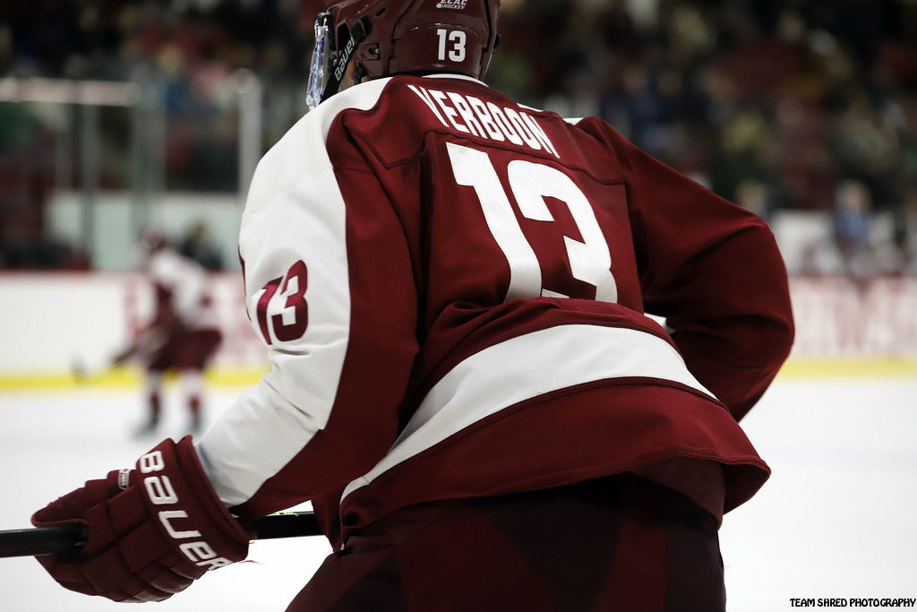 Colgate University Raiders‘ senior right wing Matt Verboon(13) is listed as a Richmond Hill, ON and Swiss native and played most of his youth hockey there before joining the BCHL for a high scoring effort with Salmon Arm Silverbacks previous to college.