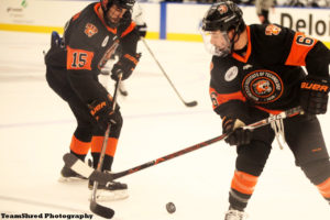 4th year center Calder Brooks(19) explodes the scoring sheet last season for Rapid City Rush, popping 19 goals and 18 assists in 43 ECHL games with a +10 rating, then added another 13 points in 11 playoff matchups.
