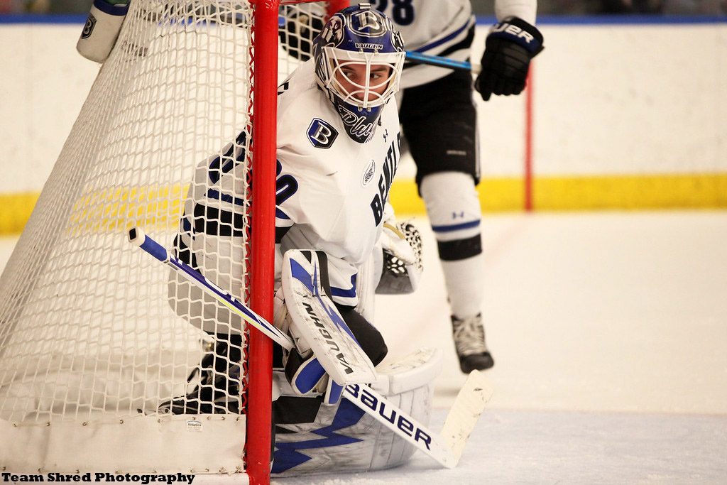 The 6’2″ 195 lbs. net minder played four seasons at Bentley University Falcons, always putting together decent stats.