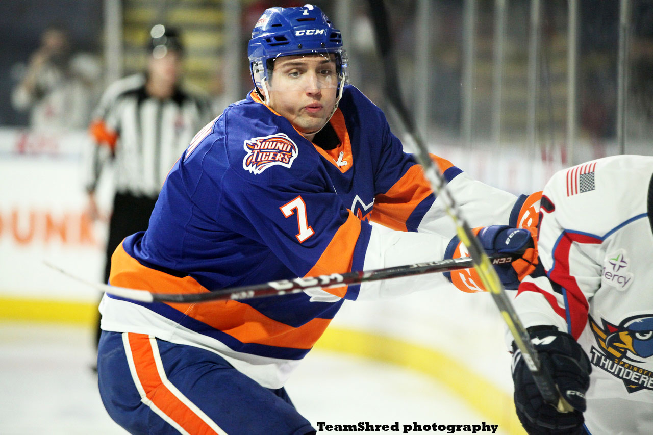 New York Islanders‘ undrafted, 3rd year defenseman Grant Hutton(7) is getting first looks at the NHL, appearing in his debut games.