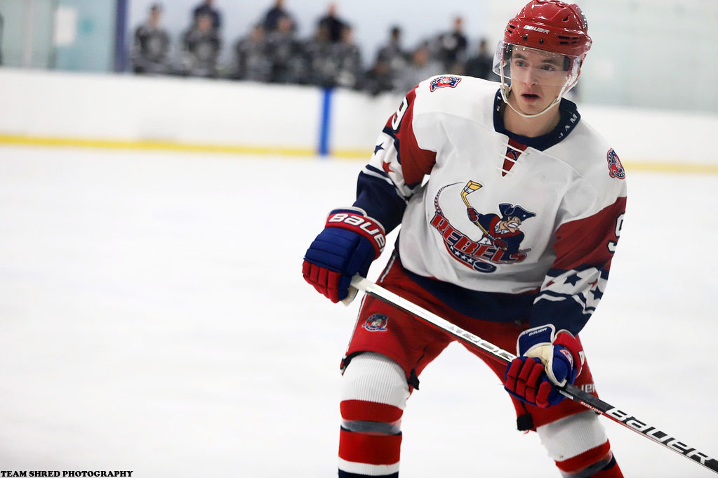 American International College Yellowjackets‘ 2022/2023 commit, center John Lundy(21) is likely ready to get started after posting a 2nd year, career best (by a mile) 32 goals and 25 assists in 60 NAHL games with a +23 rating for Jamestown Rebels.