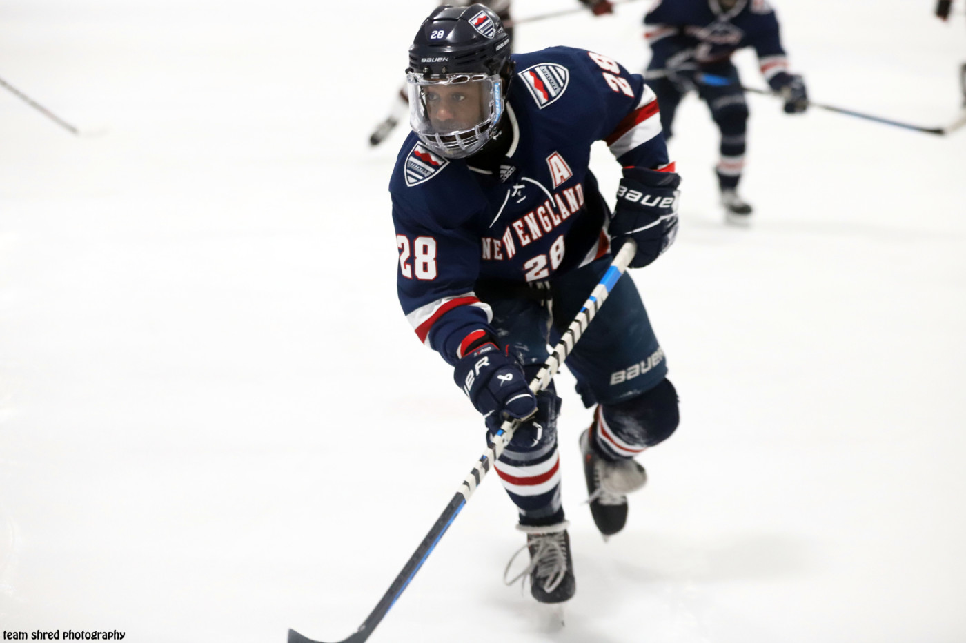 Franklin Pierce University Ravens‘ freshman defenseman Max Christiansen(24) played 3 USPHL Premier seasons with Springfield Pics before committing to his choice of schools.