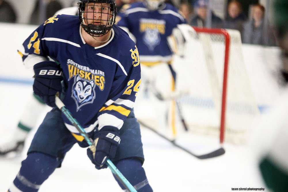 University Of Southern Maine Huskies‘ senior defenseman Kadin Ilott(11) typically put up a 10+ point season in 20+ games and last season left college with a nice +8 rating.