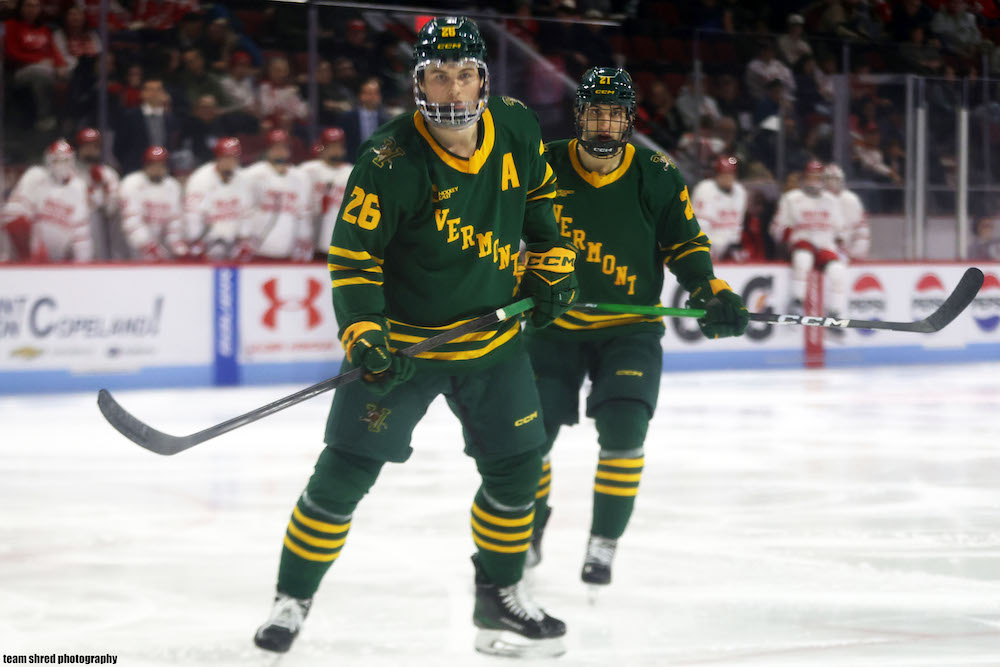University Of Vermont Catamounts‘ senior center Thomas Sinclair(92) played in a college high 35 games, scoring a new best 6 assists and 10 points that he takes to a 1st pro contract with Fort Wayne Komets.