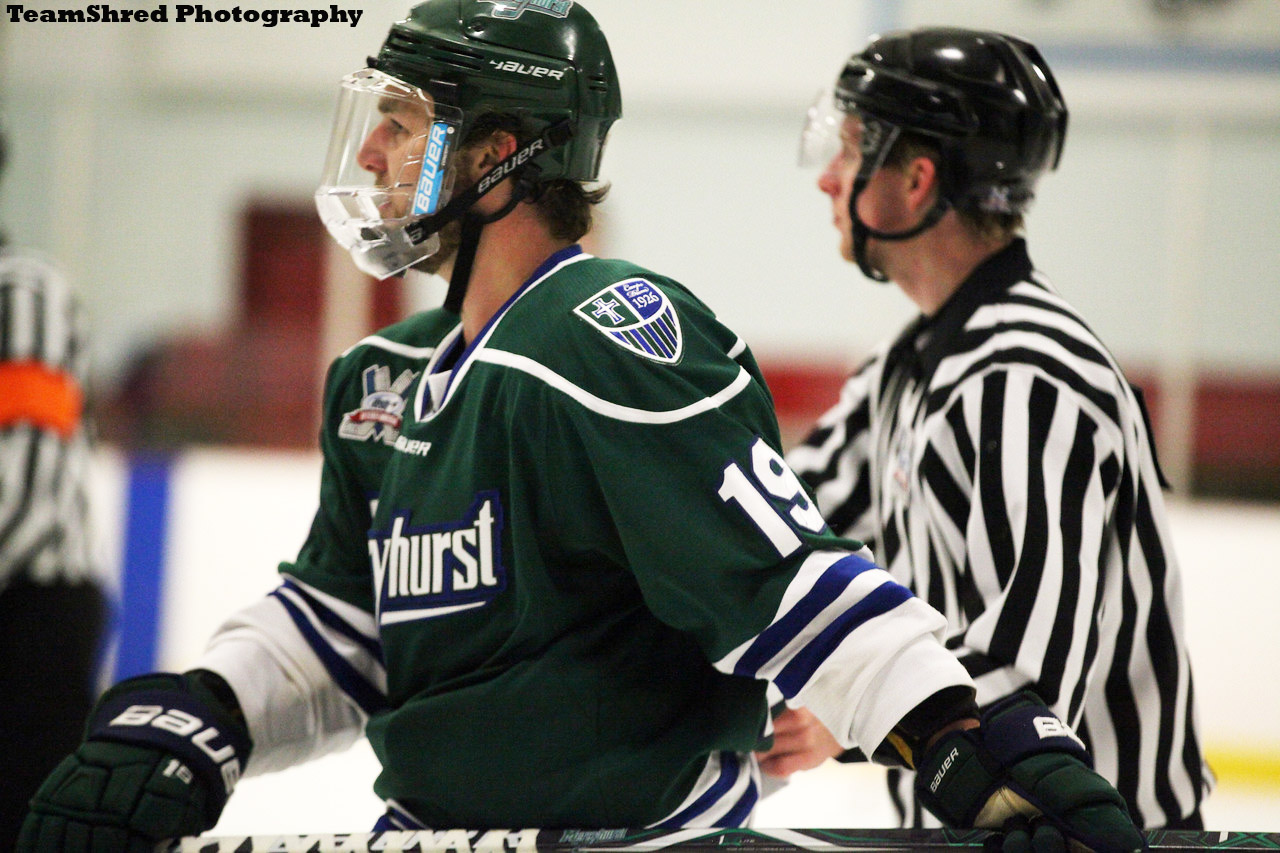 4th year center Ryan Penny(9) finishes a most interesting move to playing hockey.