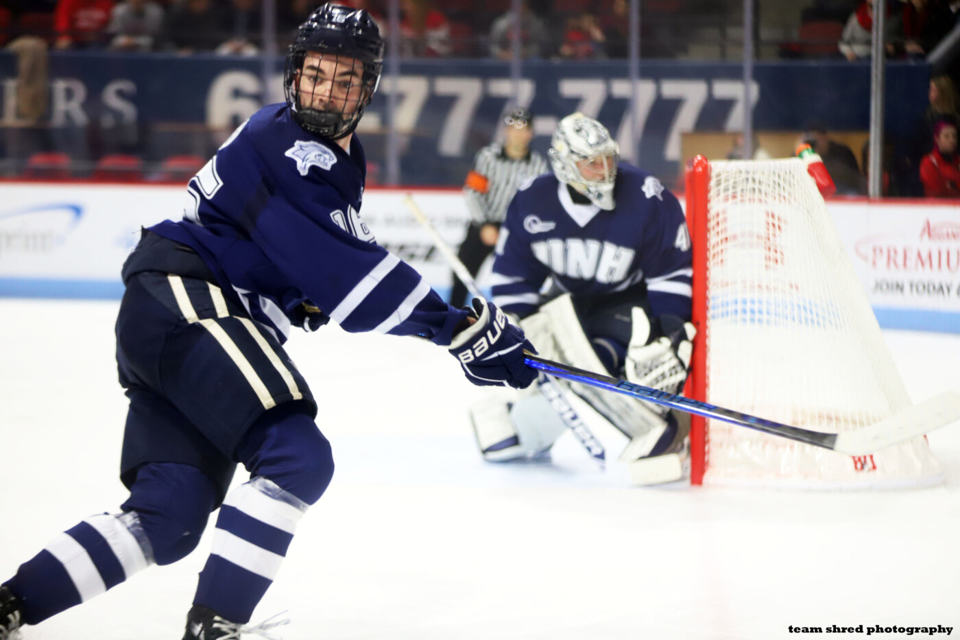 University Of New Hampshire Wildcats‘ graduate defenseman Luke Reid(16) signs a 1st pro deal with Adirondack Thunder and in 6 ECHL games had 1 goal and 1 assist with a +3 rating to get him loaned up to affiliate Utica Comets for 5 AHL games, where he got himself 2 assists and a +1 rating.
