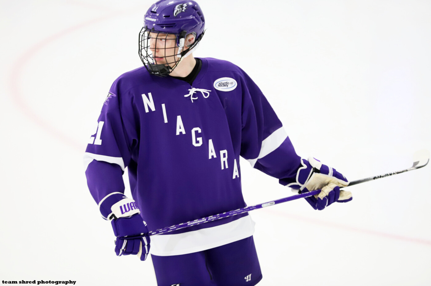 Niagara University Purple Eagles‘ senior left wing Shane Ott(27) ran up a college high 25 goals and 34 points.