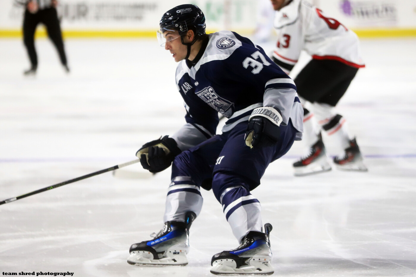 Curry College Colonels‘ graduate defenseman Billy Roche(18) signed upon graduation with Roanoke Rail Yard Dawgs, scoring a 1st SPHL goal for himself in 3 games with a +1 rating.