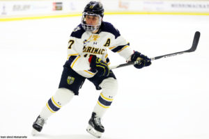 Merrimack College Warriors‘ graduate center Mac Welsher(22) already has a college career best 7 assists and we think will surpass the 7 goals he struck for as a senior.