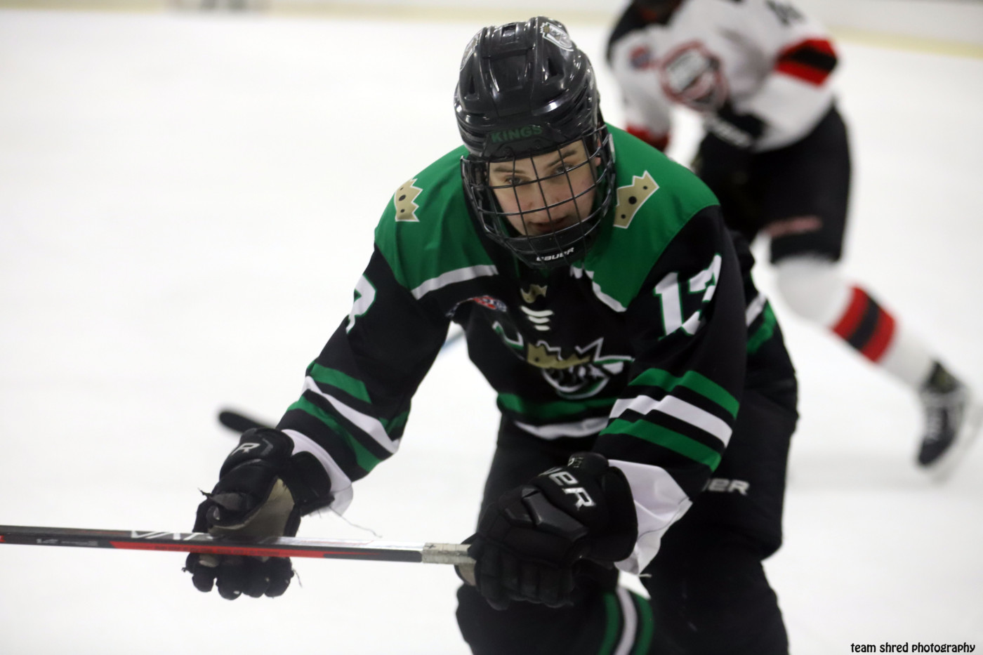 South Shore Kings‘ late arrival, right wing Jack DesRuisseaux(13) must feel like 3 teams the charm, as this is his 3rd club of his only junior season, cycling 1st through the AJHL for a 4 game taste to 15 NAHL contests with close to home New Hampshire Mountain Kings, but finally arrived in the USPHL/NCDC and looks right to earn a 2024/2025 commit to Sacred Heart University Pioneers.