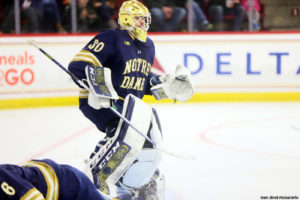 University Of Notre Dame Fighting Irish graduate goaltender Ryan Bischel(30) takes his 105 games played, 2.46 GAA, .924 SV% and 8 shutouts to a 1st pro deal with Providence Bruins.