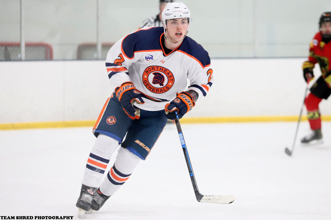Mercyhurst University Lakers‘ 2023/2024 commit, 3rd year Northeast Generals‘ defenseman captain Jackson McCarthy(2) is a sizable 6’2″ 205 lbs. wall in the zone, who is tough for offenders to get around.