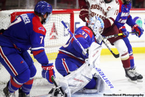 Freshman Soviet-born net minder Arsenii Sergeev(30) increases his record to 6-1-1 on the season.