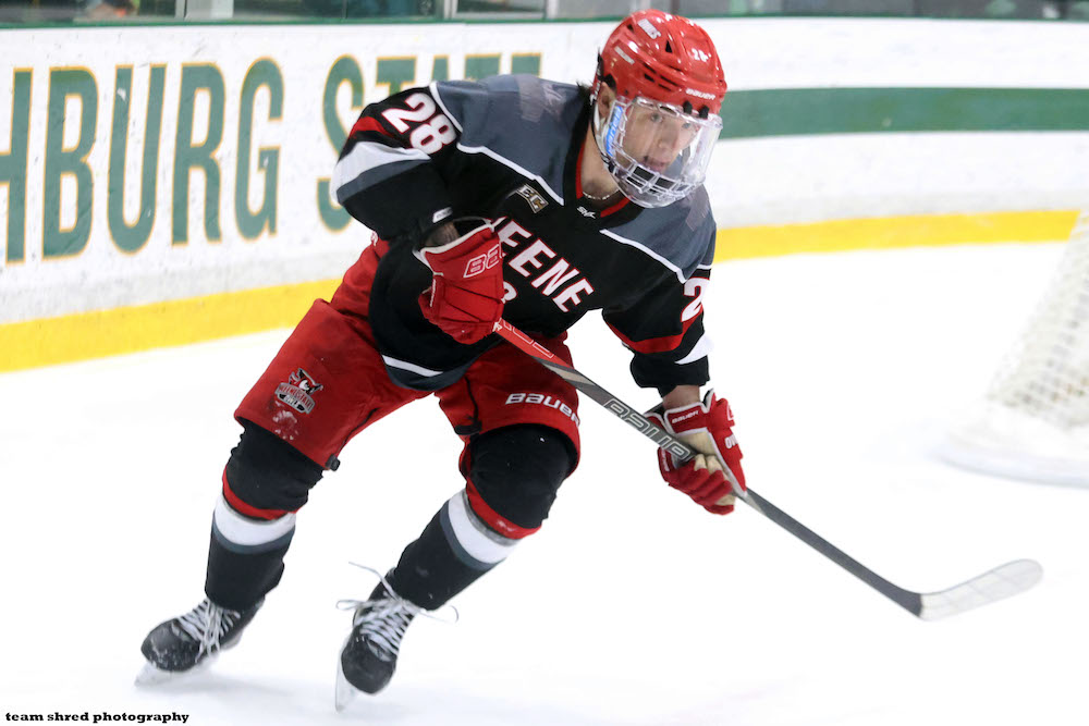 Keene State College Owls‘ freshman center Zach Chouinard(28) has found the net for 5 goals and 6 assists in 13 games with a +3 rating at the half this season.