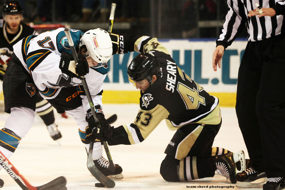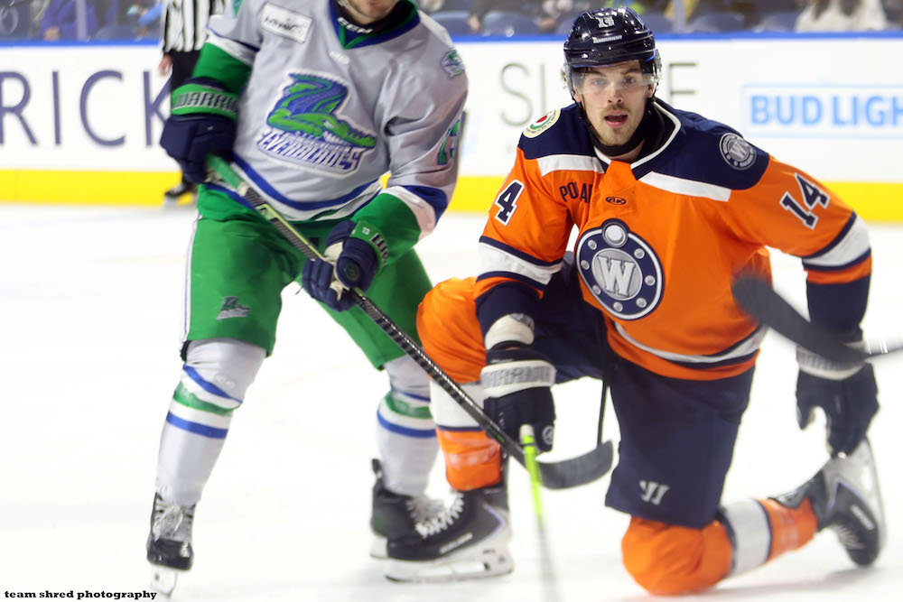 Worcester Railers‘ big 6’7″ 6th year defenseman Adam Samuelsson(14) seems to be fitting in nicely with the style of his new team with 1 assist in 21 ECHL games and a +2 rating.