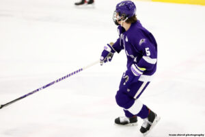 Niagara University Purple Eagles‘ senior defenseman Noah Carlin(62) played a college high 37 games, scoring a new best 4 goals, despite having better assists 9 as a junior and 12 points twice in previous frames.