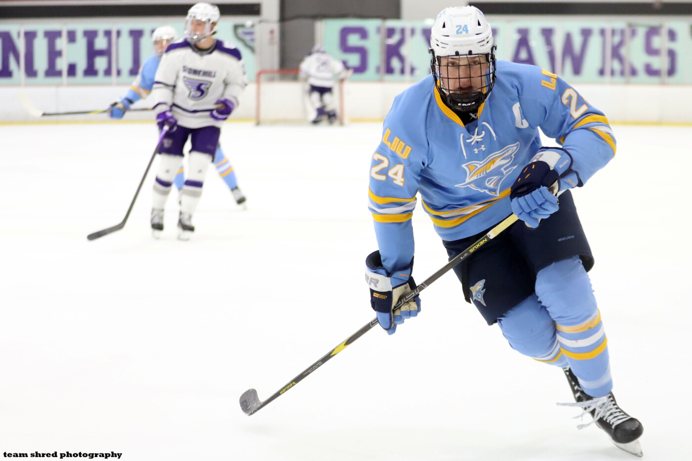 LIU Sharks‘ graduate center, captain Billy Jerry(26) is definitely putting himself on NHL scouts’ radar with his play for his new club this season after transferring from 4-years at RPI Engineers.