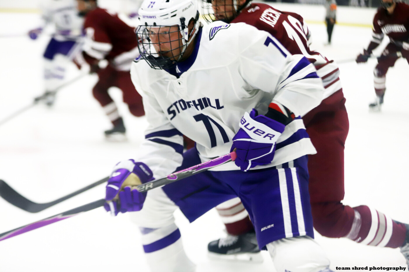 Stonehill College Skyhawks‘ junior right wing Matthew Romer(71) came to his 3rd school after 23 games with 5 goals and 3 assists for Northern Michigan University Wildcats last season.