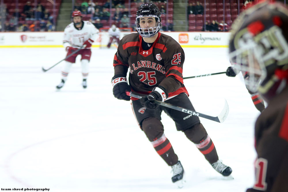 St. Lawrence University Skating Saints‘ graduate defenseman Jack Babbage(25) looks like he is well on his way to scoring college career highs this season with 4 assists in 16 games.