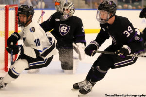 Holy Cross College Crusaders‘ sophomore center Tyler Ghirardosi(39) transferred from 1-year at Quinnipiac University Bobcats with no hockey and is lighting it up.