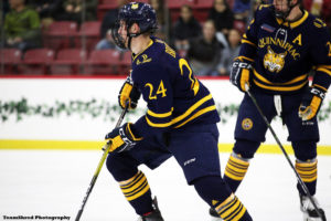 Undrafted defenseman Logan Britt(24) switches up two years at Quinnipiac University Bobcats to a new adventure with Sacred Heart University Pioneers.