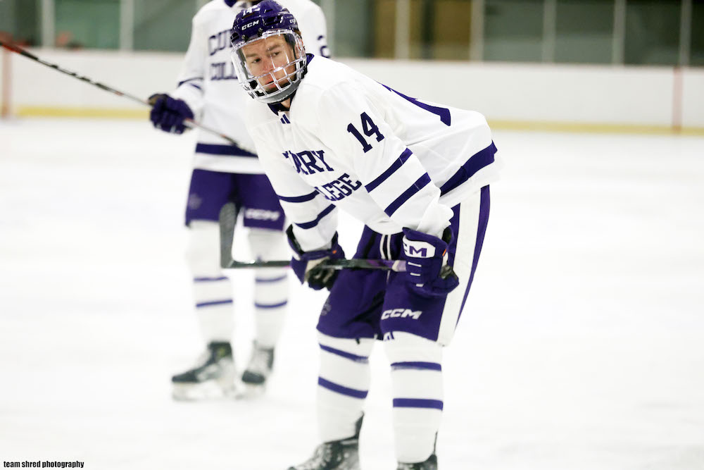 Curry College Colonels‘ senior center Gage Dill(91) scored 3 college seasons of 10+ goals and assists and ran up a +55 rating through 4 years, including a 100 point scoring totals.
