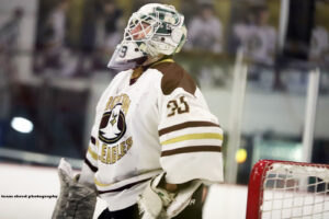Boston Jr. Eagles 1st year net minder Caden Pasqualone(35) played 28 games last season, posting a 12-12-2 record on an average club.