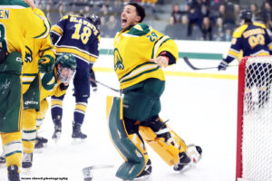 The small 5’9″ 165 lbs. goalie commits to Nazareth University Golden Flyers for 2025/2026.