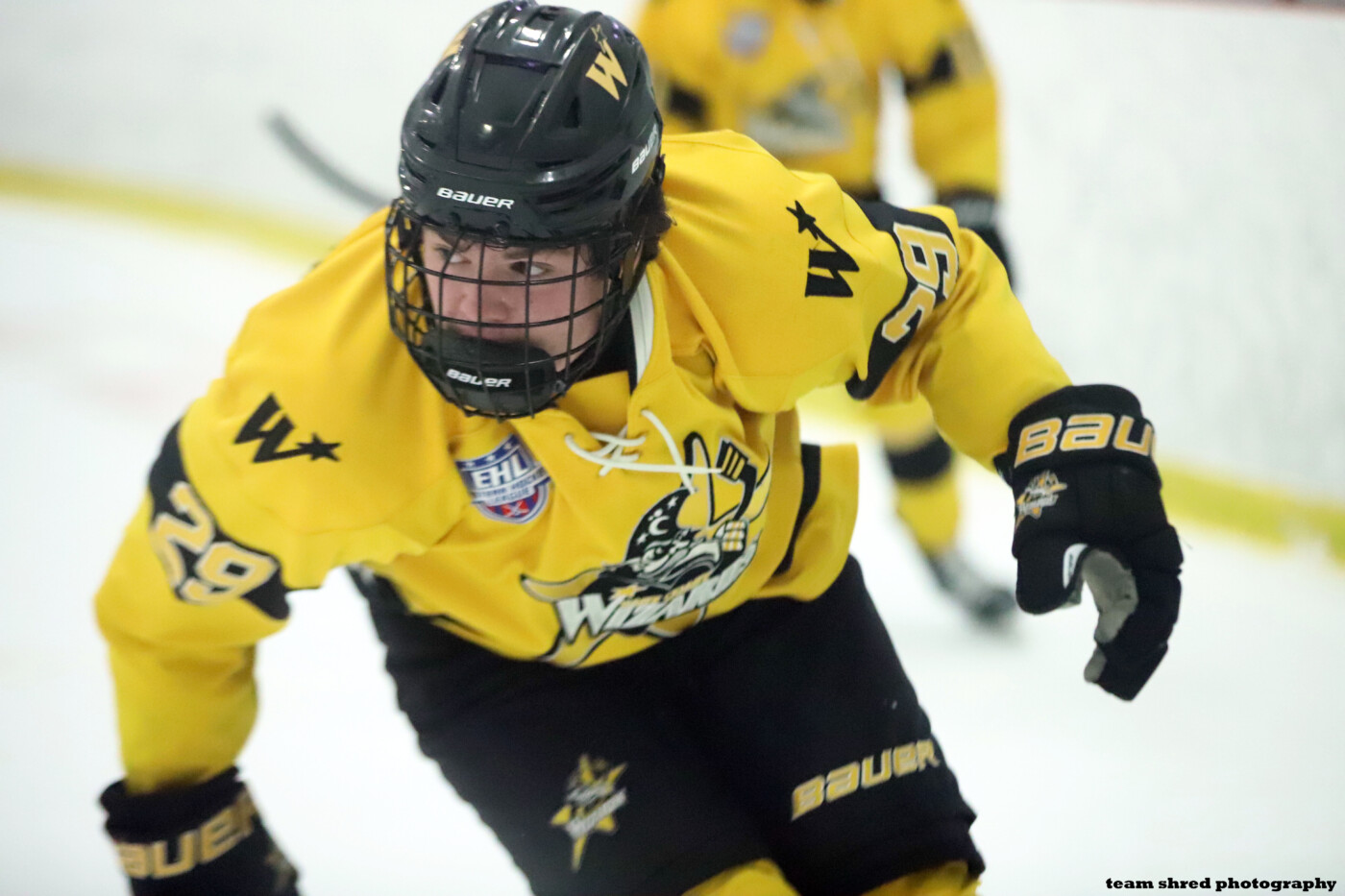 East Coast Wizards‘ 2nd year center Daxton St. Hillaire(29) takes a top scoring EHL junior season and commits to the new D3 program at Roger Williams University Hawks for 2025/2026.