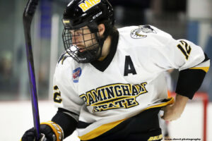 Framingham State University Rams‘ junior defenseman, assistant captain Cameron Craig(12) has 1 assist in 3 games and we think will post college scoring highs this season.