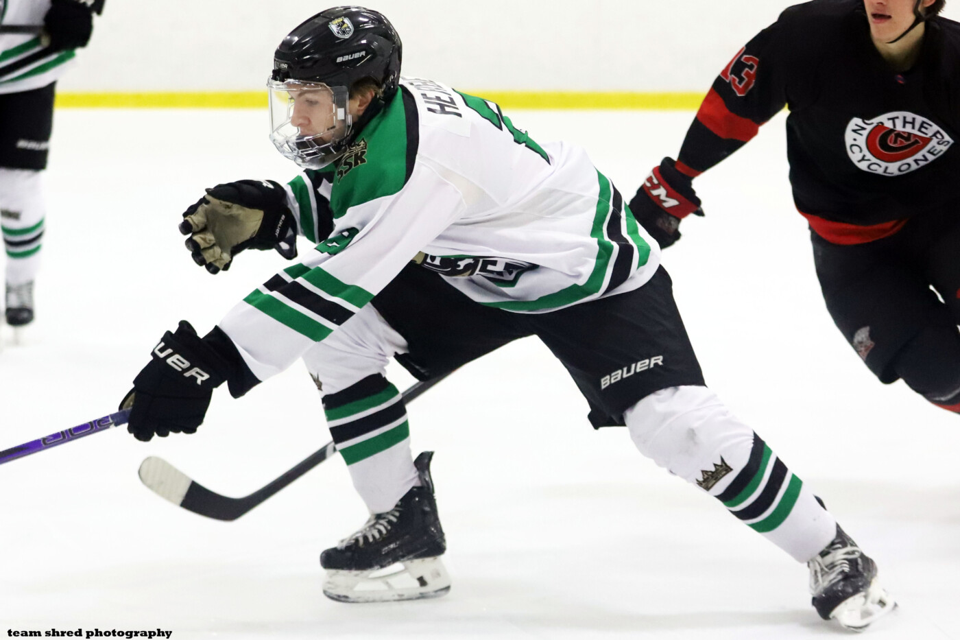 South Shore Kings‘ 1st year right wing Logan Herbener(28) looks out there to commit for 2025/2026 at University Of Wisconsin-Superior Yellowjackets.