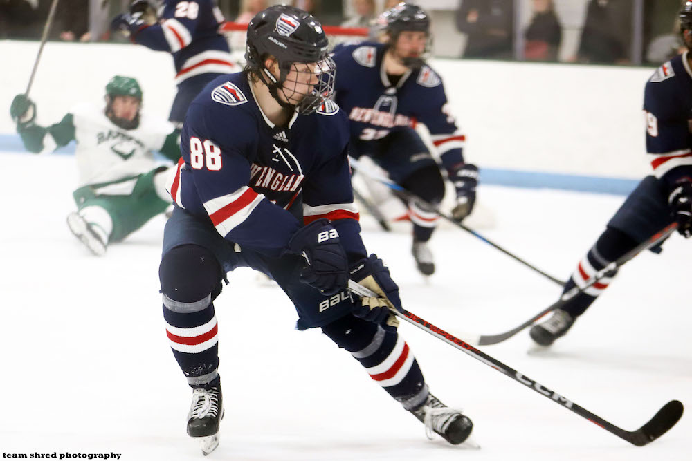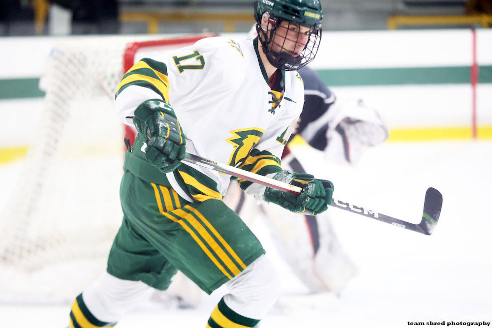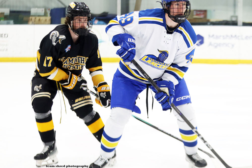 Framingham State University Rams‘ freshman left wing Grig Kaagan(17) committed from 1 EHL season for Bridgewater Bandits, where he scored 8 goals and 11 assists in 42 games.