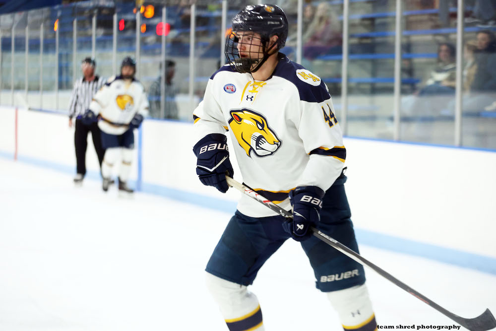 MCLA Trailblazers‘ freshman defenseman Kieran Kenny(44) has a 1st college hockey goal and 2 assists in 14 games with a -1 rating on a team that has once again struggled to win games this season.