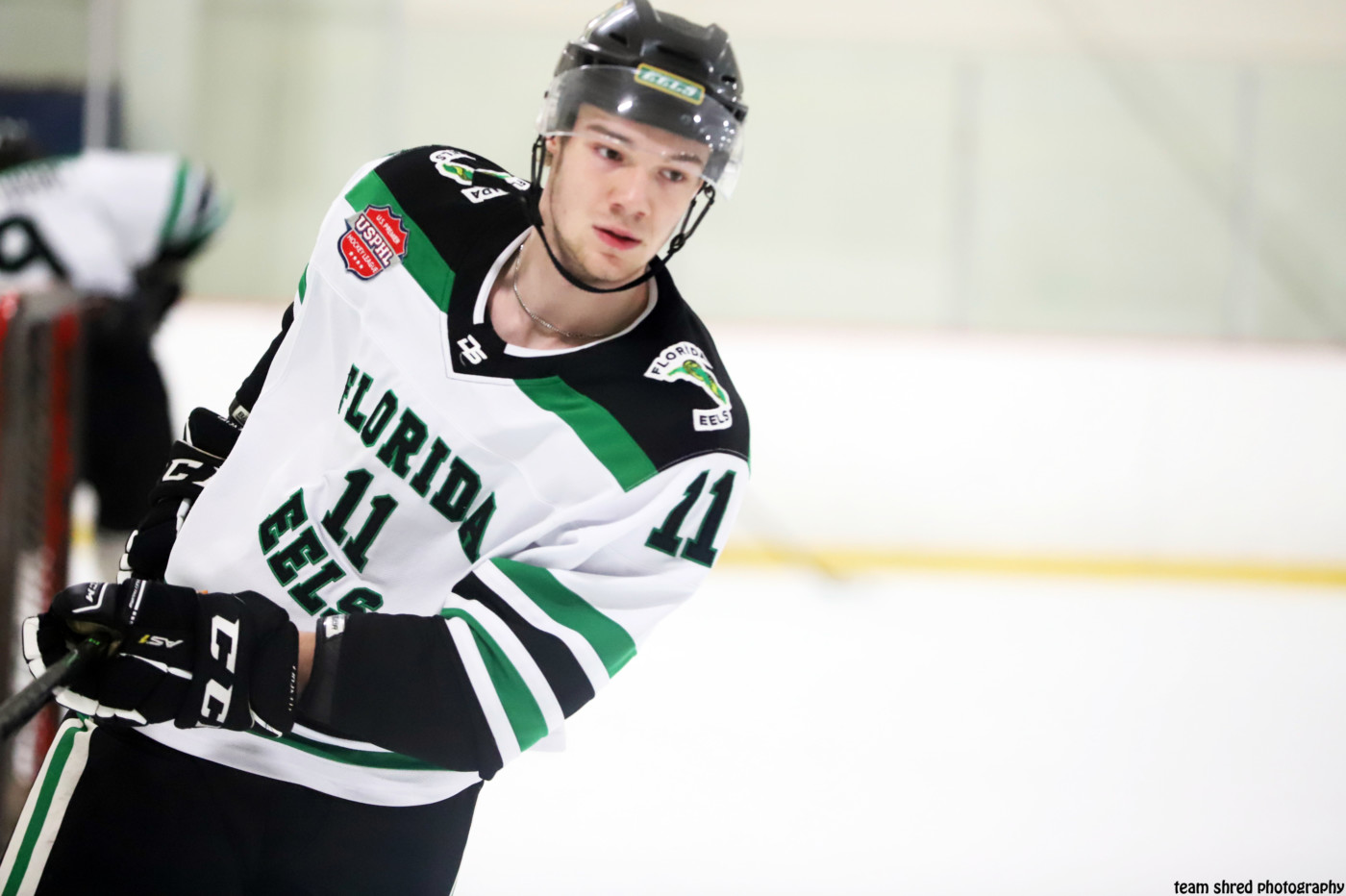 Florida Eels‘ 3rd year left wing Devin Shepherd(11) puts up USPHL Premier bests 11 goals and 29 assists in 36 games last season and will take those stats to a 2024/2025 commit at Framingham State University Rams.