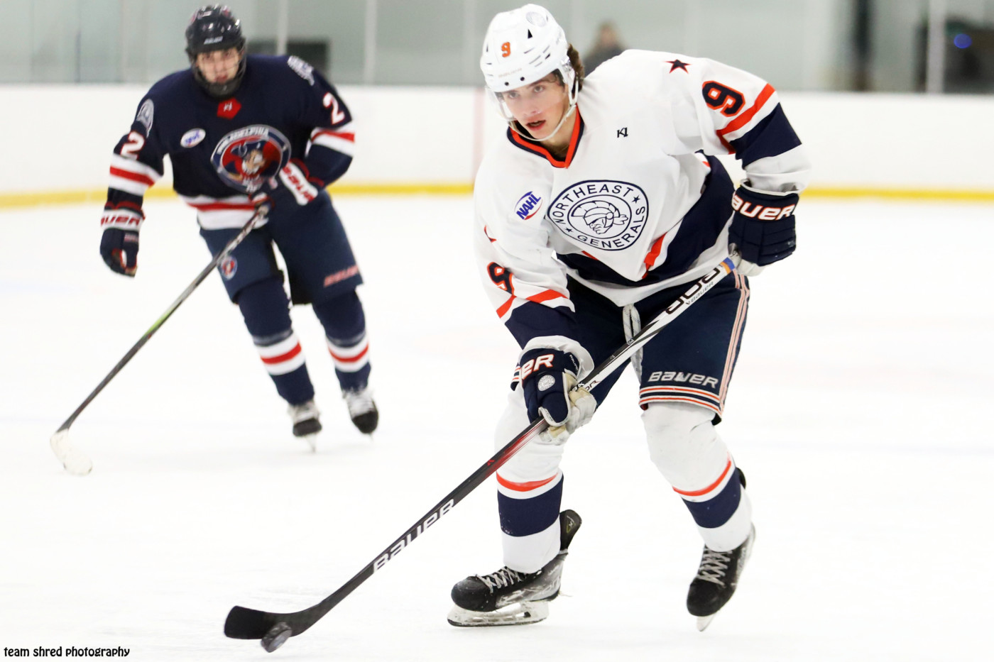 Northeast Generals‘ 2nd NAHL year right wing Jacob Wilson(9) takes a junior hockey best 15 goals, 22 assists and 37 points in 57 games to a 2024/2025 commit at Trinity College Bantams.