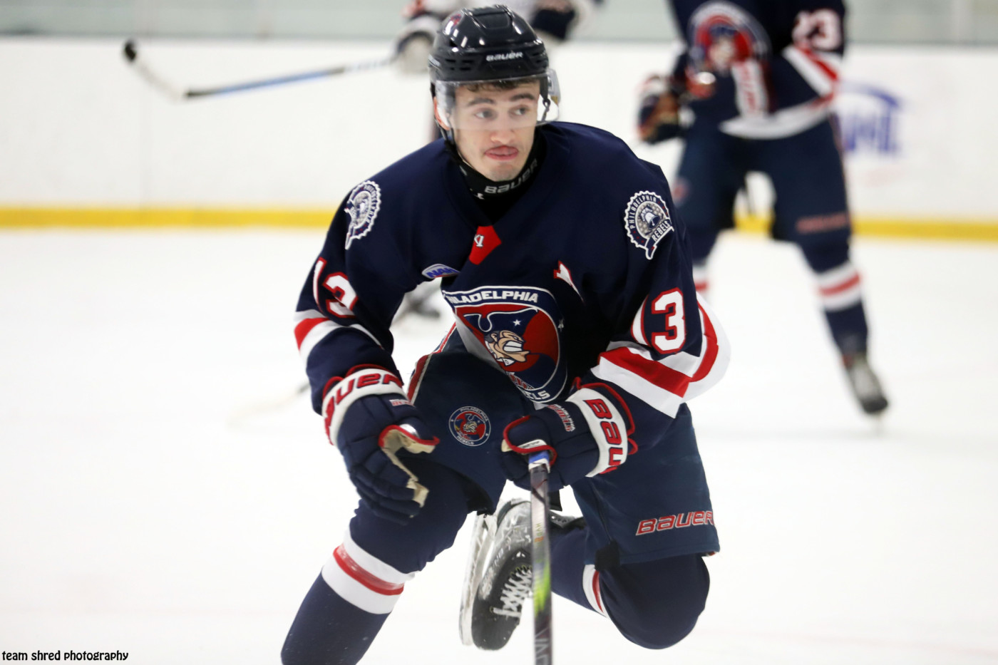 Philadelphia Rebels‘ 2nd NAHL year defenseman Sonny DiNubile(13) stays close, as he has always done to play his hockey with his 2024/2025 commit to Neumann University Knights.