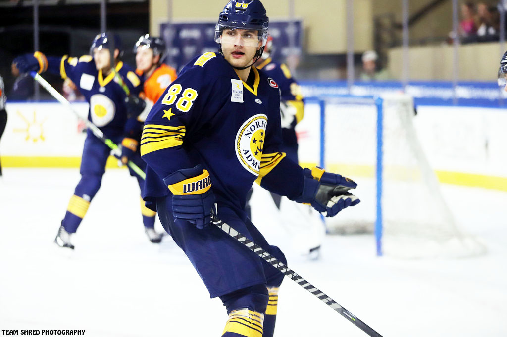 3rd year defenseman Elijah Vilio(41) re-signs to stay with Savannah Ghost Pirates after going there mid-last season from Norfolk Admirals.