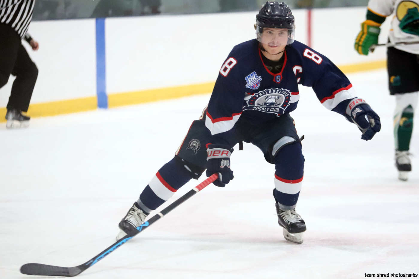 Philadelphia Hockey Club 2nd year left wing, captain Elijah Clow(8) is set to put up junior hockey best stats in all categories with a new high 5 goals, tying 10 assists and 15 points in just 28 EHL games before he commits to Alvernia University Knights for 2024/2025.