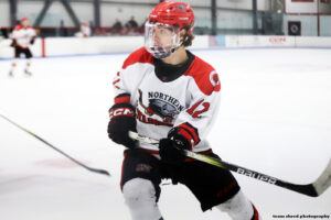 Northern Cyclones‘ 2nd year left wing Isac Martins(12) takes 13 goals and 13 assists in 54 USPHL/NCDC games to a 2025/2026 commit at St. Anselm College Hawks.