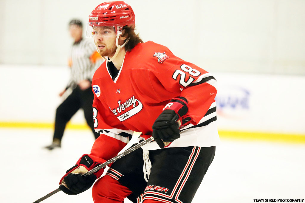 New Jersey Jr. Titans‘ 2nd year, assists captain defenseman Tyler Sanborn(28) had quite the scoring uptick in his game, getting 7 goals and 18 assists with a +19 rating through 55 NAHL games last season.