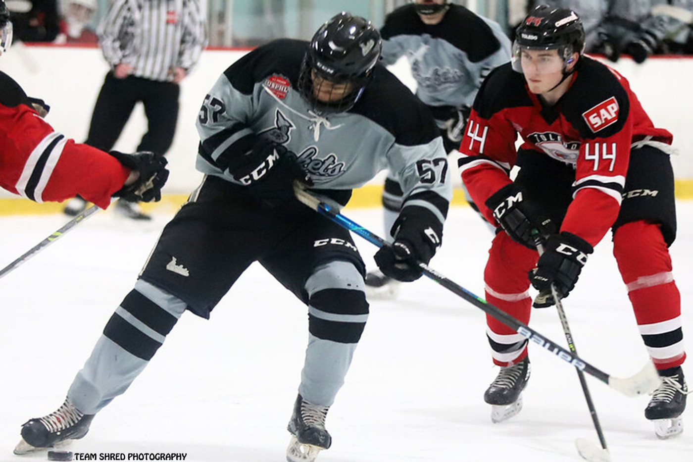 Plymouth State University Panthers‘ 2023/2024 commit, defenseman Eddie Mulligan(6) had a solid 2nd junior season in the EHL split between a couple clubs, gaining 13 goals and 17 assists in 44 games.