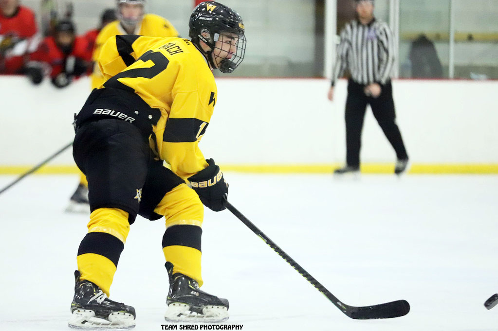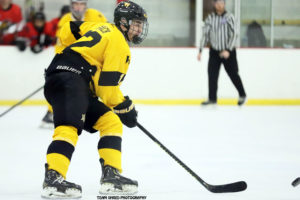 Endicott College Gulls‘ 2023/2024 commit, 2nd year Valley Jr. Warriors‘ defenseman Dominic Metro(7) is a nice grab for the school.