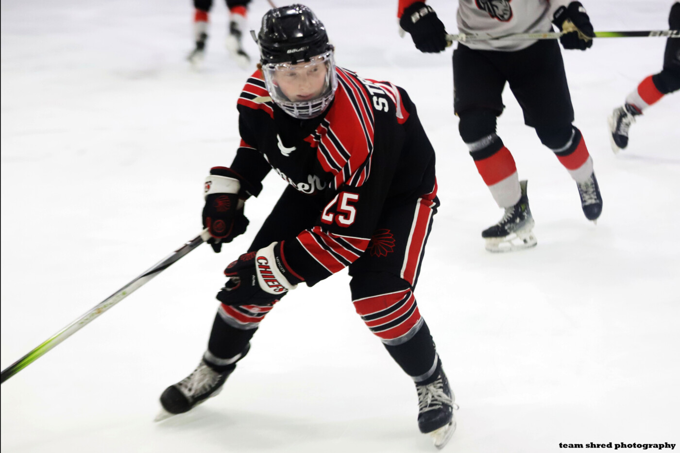 Mercer Chiefs‘ 1st year left wing Ryan Stratton(25) takes virtual point-per-game numbers from last USPHL/NCDC season to a 2025/2026 commit at Skidmore College Thoroughbreds.