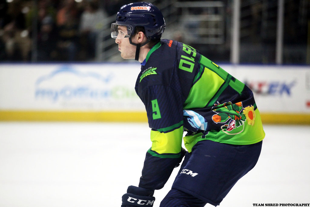 4th year center Ross Olsson(9) returns to Orlando Solar Bears, where he spent 10 ECHL games last season, potting 2 goals and 5 assists.