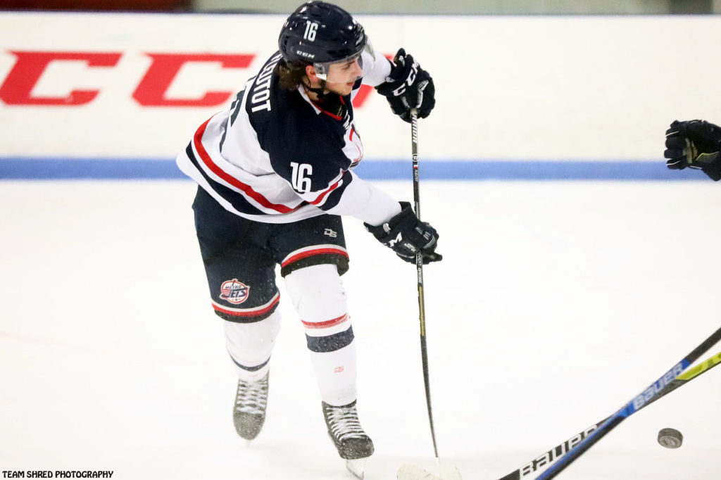 2nd year Metro Jets‘ French-born right wing Andreas Fleutot(16) struck gold in his 1st USPHL Premier frame with the team capturing 27 goals and 48 assists in 41 games, then in his 2nd outing had 26 goals and assists in 31 matchups.