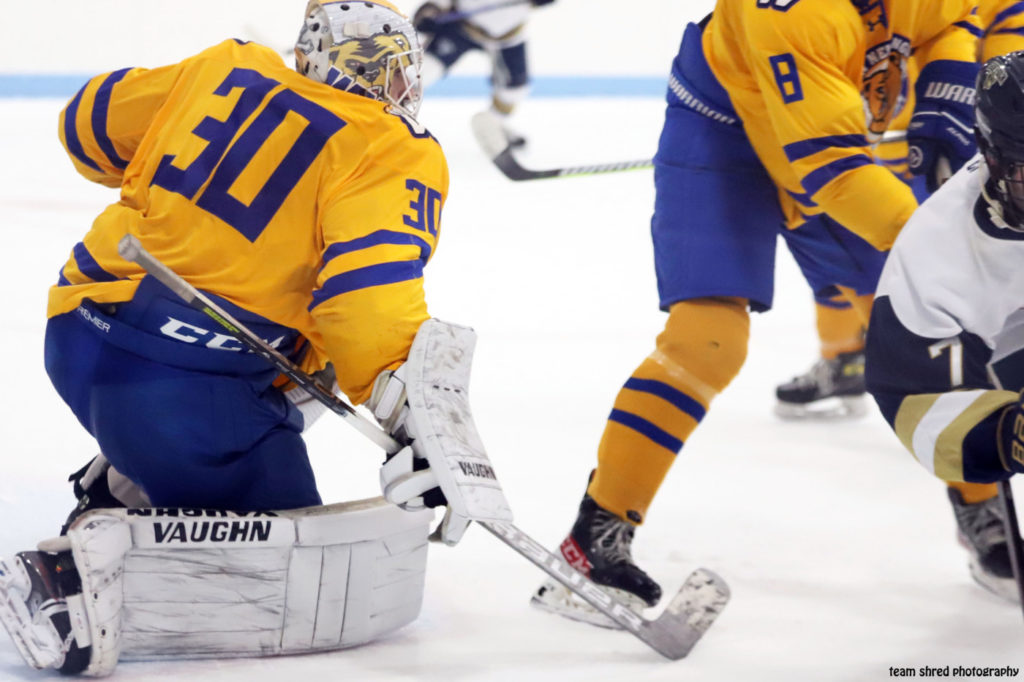 Western New England University Golden Bears‘ senior goalie transferred from 2 years at Riviers University Raiders, which followed a single frame at Becker College Hawks before that school went belly-up.