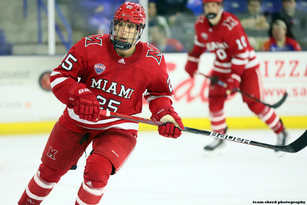Miami University (Ohio) Redhawks‘ Slovakian-born junior left wing Artur Turansky(17) figured into only 11 games last season with 1 assist, so maybe decides to head back home to Slovak Extraliga and start his pro career, signing with HK Spisska Nova Ves for 2025/2026.
